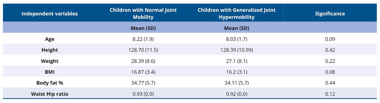 The study included 209 children with normal joint mobility and 104 children with generalized joint hypermobility. The mean age for the overall cohort was 8.12 years, with no significant difference observed between the hypermobile and non-hypermobile groups. Baseline anthropometric characteristics, including height, weight, and body mass index (BMI), were also similar between the groups. As BMI does not distinguish between muscle and fat mass, estimates of body fat percentage and waist-hip ratio were additionally included in the demographic comparison. These measures were also similar across both groups (Table 1).