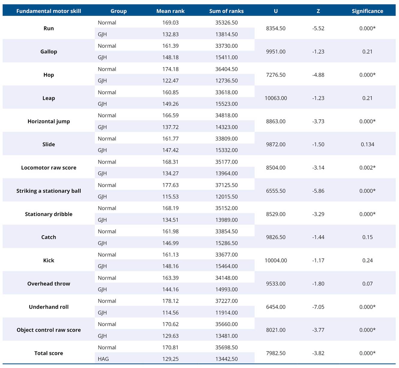 Physical fitness and TGMD-2 data, specifically locomotor and object control scores, were collected for the study. Normality tests (Kolmogorov-Smirnov and Shapiro-Wilk tests; p < 0.001) indicated that the data were not normally distributed. Therefore, the Mann-Whitney U test was used to analyze differences in these scores between children with normal joint mobility and those with generalized joint hypermobility.