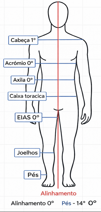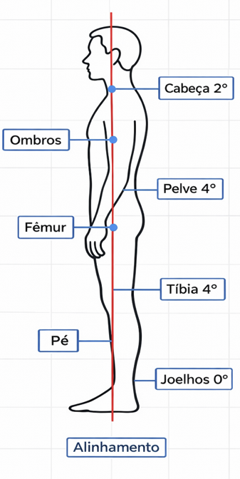 · Vista sagital: ângulo de protrusão cefálica (cabeça para frente), inclinação do tronco, inclinação pélvica e alinhamento da articulação do joelho.