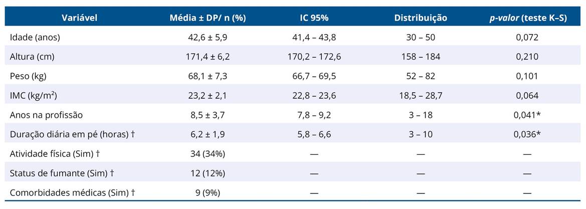 Um total de 100 seguranças homens participaram do estudo. A idade média foi de 42,6 ± 5,9 anos, com índice médio de massa corporal (IMC) de 23,2 ± 2,1 kg/m2. A maioria das variáveis demográficas estava normalmente distribuída (p > 0,05), exceto anos de experiência e duração em pé (p < 0,05). Os participantes relataram estar em pé em média de 6,2 ± 1,9 horas por dia e tinham uma média de 8,5 ± 3,7 anos de experiência profissional. Aproximadamente um terço praticava atividade física regular (34%), enquanto 12% relataram ser fumantes ativos. Nove participantes (9%) indicaram comorbidades médicas conhecidas, como hipertensão ou diabetes (Tabela 1).
