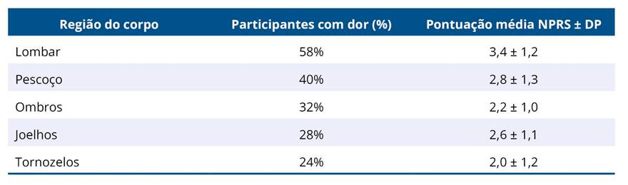 A distribuição da dor entre as regiões anatômicas está resumida na Tabela 5. A região lombar foi a mais frequentemente afetada (58%), com intensidade média da dor de 3,4 ± 1,2 na Escala Numérica da Dor (NPRS), seguida pelo pescoço (40%) e ombros (32%). A intensidade média da dor variou de 2,0 a 3,4 em todas as regiões, indicando desconforto de leve a moderado.