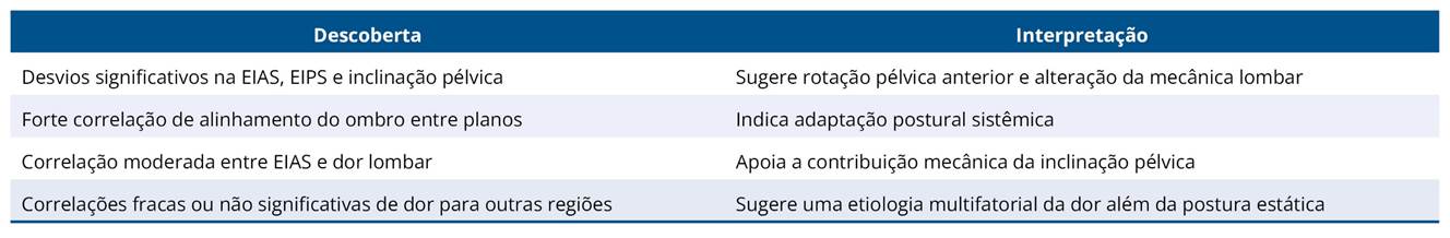Entre as variáveis avaliadas, a relação mais notável foi entre a inclinação da EIAS e a dor lombar. Essa associação é biomecanicamente plausível, pois a inclinação pélvica anterior pode aumentar a lordose lombar e a carga espinhal, aumentando assim o estresse mecânico sobre as estruturas posteriores²². No entanto, outros desvios, como a inclinação da EIPS e o alinhamento dos ombros, não mostraram associação significativa com a gravidade da dor, refletindo o entendimento atual de que a postura sozinha não explica totalmente os sintomas musculoesqueléticos2,13.