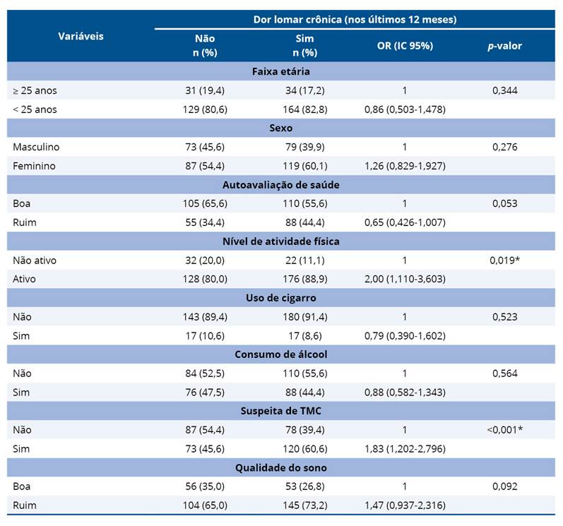 Em relação à dor lombar, observou-se uma maior prevalência em adultos com menos de 25 anos (82,2%, n = 164). Contudo, não foram encontradas diferenças estatísticas em comparação àqueles que não apresentavam dor lombar. Da mesma forma, não se observaram diferenças significativas em relação à percepção de saúde, ao consumo de bebida alcoólica, ao uso de cigarro e à qualidade do sono (p > 0,05). Foi encontrada uma associação significativa entre a dor lombar e ser ativo fisicamente, bem como a suspeita de TMC (p < 0,05), em comparação àqueles que não apresentavam essas condições (Tabela 3).
