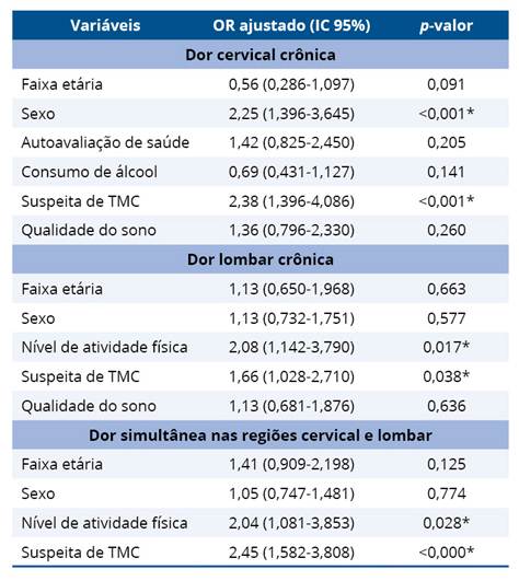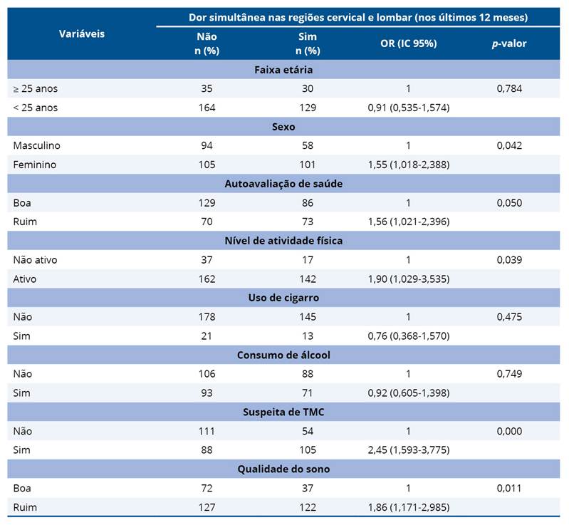 Ainda na análise bivariada, observou-se que a dor simultânea nas regiões cervical e lombar esteve significativamente associada ao sexo feminino (OR = 1,55; p = 0,042), autoavaliação de saúde ruim (OR = 1,56; p = 0,050) ser fisicamente ativo (OR = 1,90; p = 0,039), suspeita TMC (OR = 2,45; p = <0,001) e qualidade do sono ruim (OR = 1,86; p = 0,011) (Tabela 4).