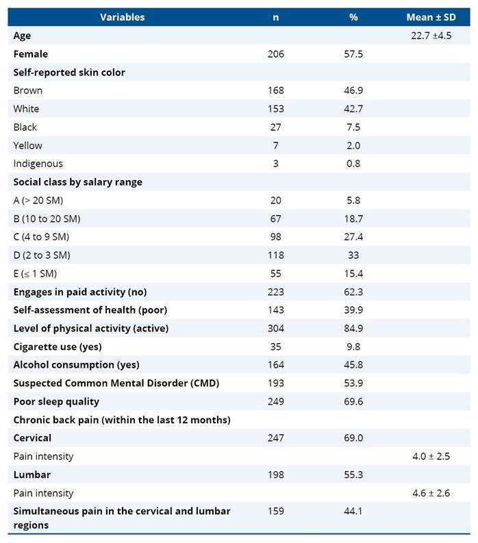The average age was 22 years (±4.5), with higher proportions of women (57.5%; n=26), brown skin color (46.9%; n=168), social class D (33%; n=118), and those not engaged in paid activity (62.3%; n=223). It was found that 39.9% (n=143) reported poor self-assessment of health, 84.9% (n=304) were classified as physically active, and only 9.8% (n=35) smoked. However, 45.8% (n=164) consumed alcoholic beverages, 53.9% (n=193) presented suspected Common Mental Disorder (CMD), and 69.6% (n=249) presented poor sleep quality (Table 1).