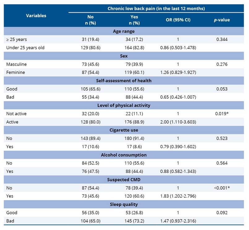 Table 3. Relationship between prevalence of chronic low back pain and biopsychosocial factors among university students. Fortaleza, Ceará, Brazil, 2022