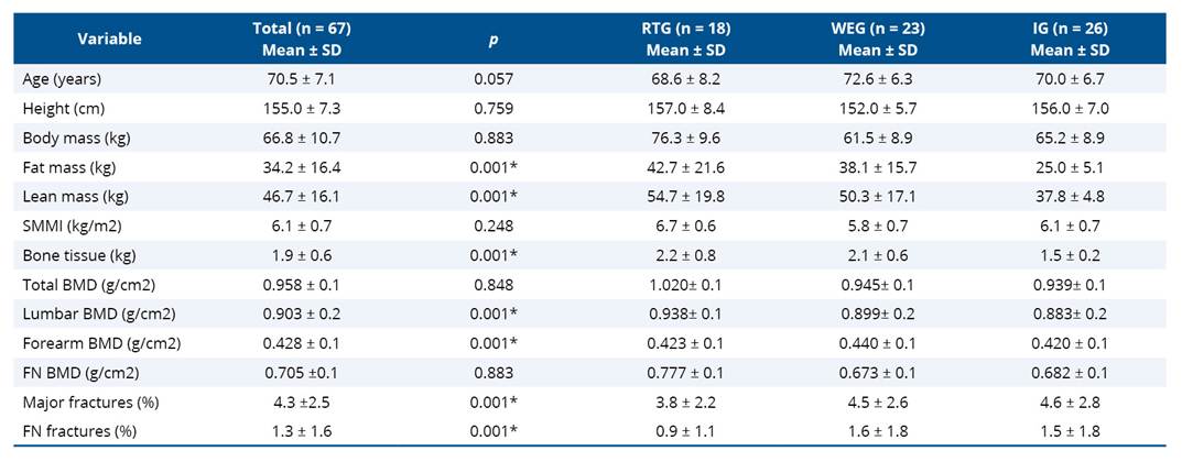 * p < 0,05; RTG: Resistance Training Group; WEG: Water-based Exercise Group; IG: Inactive group; SMMI: Skeletal Muscle Mass Index; BMD: Bone Mineral Density; FN: Femoral Neck.