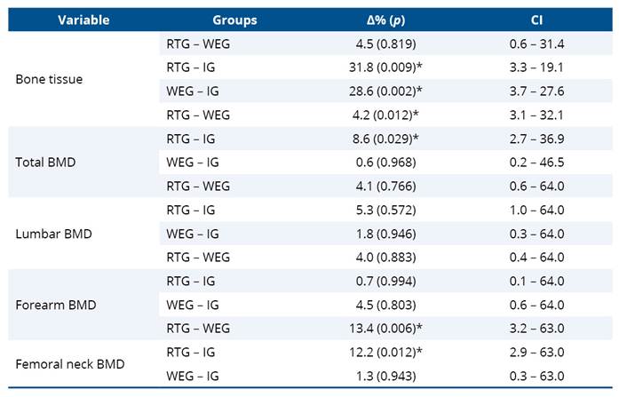* p < 0,05; RTG: Resistance Training Group; WEG: Water-based Exercise Group; IG: Inactive group; BMD: Bone Mineral Density.