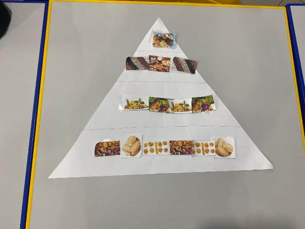 Pirâmide alimentar desenhada em cartolina com impressões de alimento