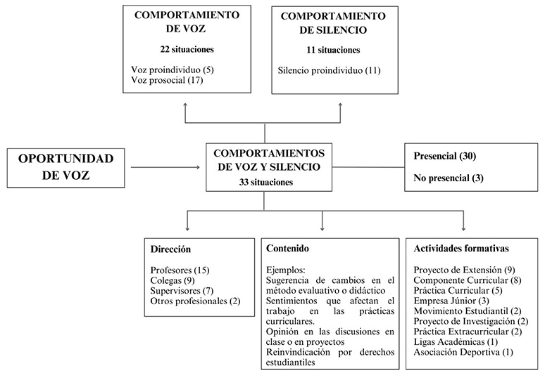 Para garantizar el anonimato, durante la presentación de los resultados se utilizarán nombres ficticios elegidos por los propios participantes. Los 10 participantes informaron de 33 situaciones en las que tenían ideas, sugerencias, opiniones, preocupaciones u opiniones relacionadas con el trabajo desarrollado durante su formación en Psicología (Figura 1). De estas, 22 eran situaciones relacionadas con comportamientos de voz y 11 sobre conductas de silencio. En cuanto al contexto de las situaciones, 30 ocurrieron en ambientes presenciales y solo tres se registraron en contextos no presenciales, como reuniones virtuales o comunicaciones por mensajes.
