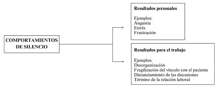 Los comportamientos de voz y silencio pueden producir consecuencias tanto a nivel individual como en el trabajo desarrollado durante las actividades de formación. Cuando los estudiantes decidieron no expresar sus ideas, quejas, opiniones y sentimientos, experimentaron resultados personales como angustia, estrés y frustración (Figura 2).