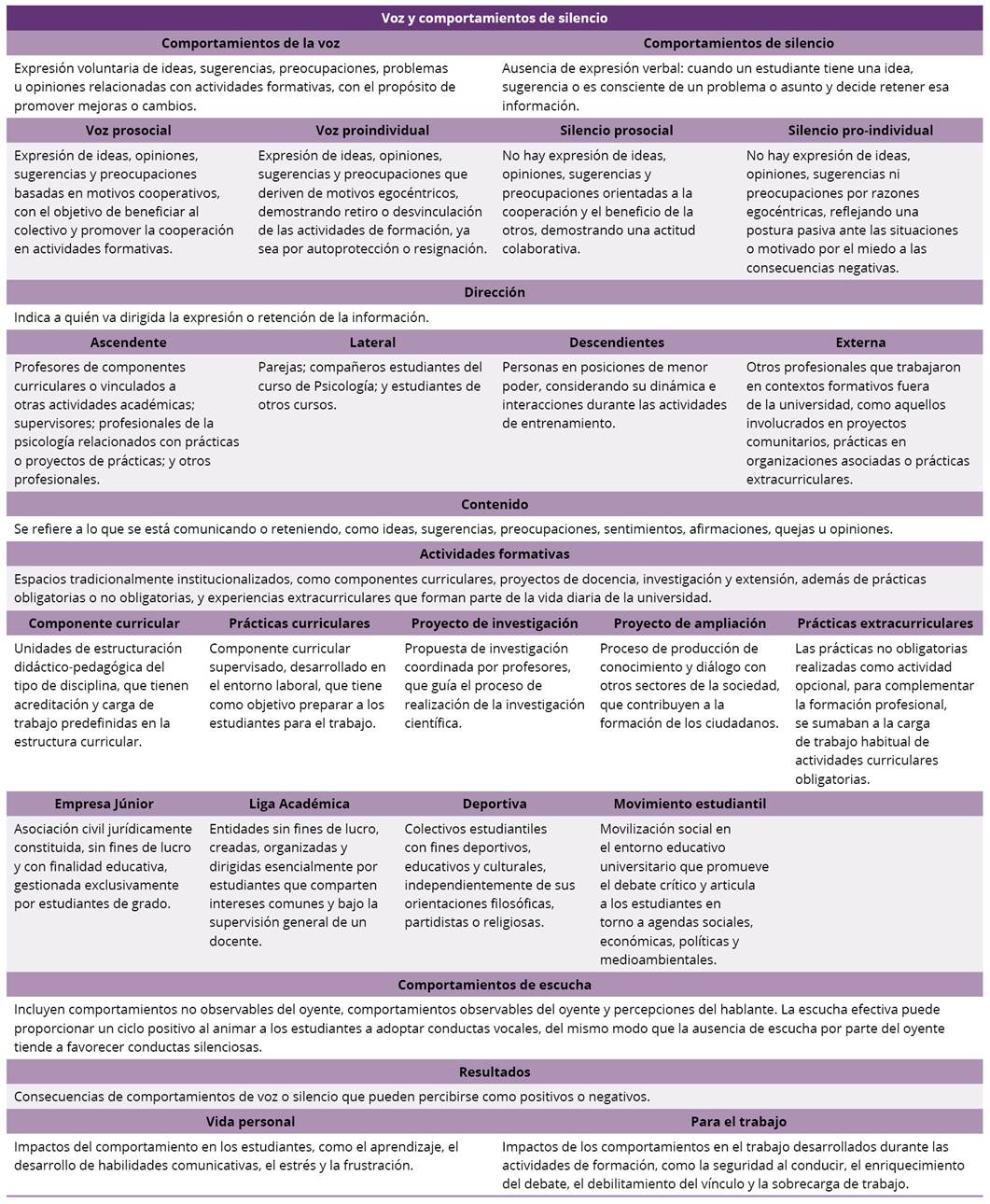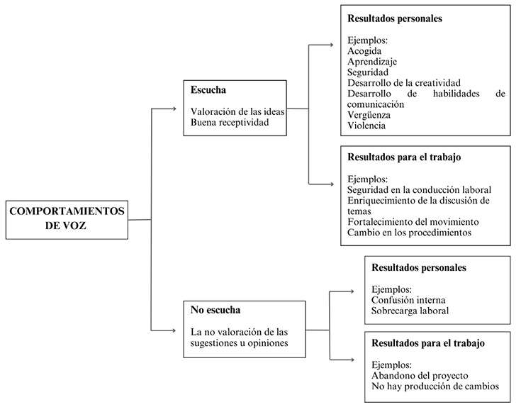 En esta investigación, se desarrollaron algunas categorías basándose en el trabajo de Brinsfield et al. (2009), en las que se destacan aspectos importantes para la comprensión de los comportamientos de voz o silencio, incluyendo el tipo de comportamiento (voz o silencio), la dirección (ascendente, lateral, descendente o externa) y el contenido (ideas, sugerencias, preocupaciones, sentimientos, afirmaciones, quejas u opiniones). Además, basándose en Andrade y Bastos (2020), se consideró la tipología de los comportamientos de voz y silencio, dividida en prosociales y proindividuales. Basándose en los estudios de Morrison (2023), fueron investigados los resultados personales o laborales de estos comportamientos.