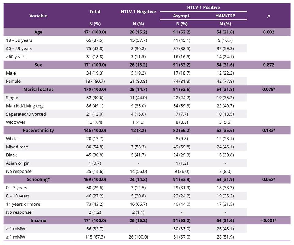 Sociodemographic characteristics of the 171 participants according to infection status (no infection, HTLV-1 asymptomatic and HAM/TSP), CHTLV, EBMSP, 2015