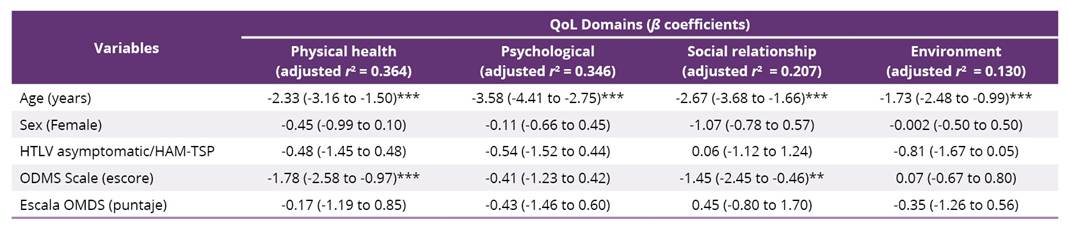 Bivariate analysis revealed the presence of HAM/TSP to be associated with lower overall QoL scores and lower scores in the physical, psychological, and social relationship domains than in asymptomatic individuals (p<0.001). Additionally, compared to uninfected individuals, asymptomatic patients presented lower QoL scores in the physical health domain (p=0.039).